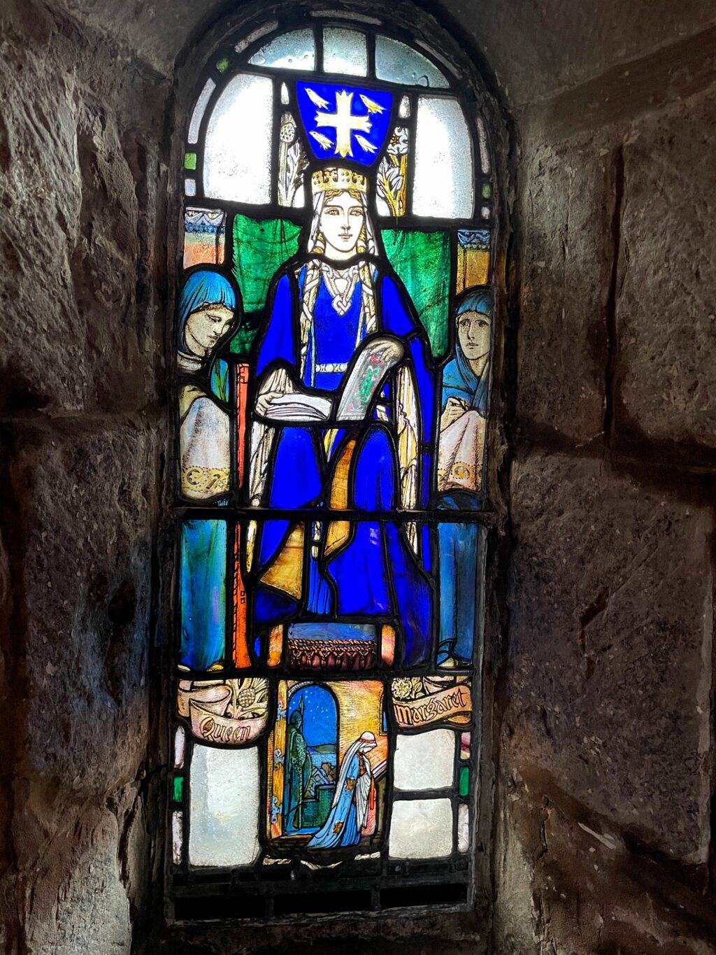 ステンドグラスの中央にいるのが、この教会堂の名前の由来となった11世紀のスコットランド王妃「聖マーガレット」という人物 🏴